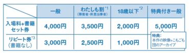 *1「わたしも割」とは:障害や病気、慢性的な不調など、からだやこころに事情をお持ちの方のためのチケットです。 障害者手帳・指定難病登録者証などをお持ちの方はもちろん、証明書をお持ちでない方も自己申告でご利用いただけます。ご同伴の介助者の方は1名まで無料でご入場いただけます。