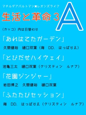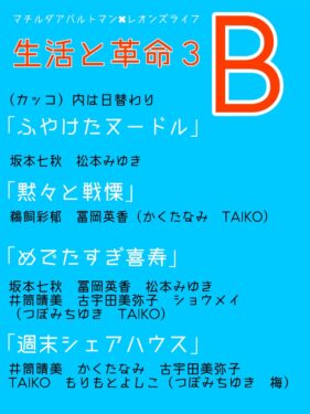 13 日(土)12:00 A(休:はっぱりえ)15:00 B 18:30 A(休:クリスティン)