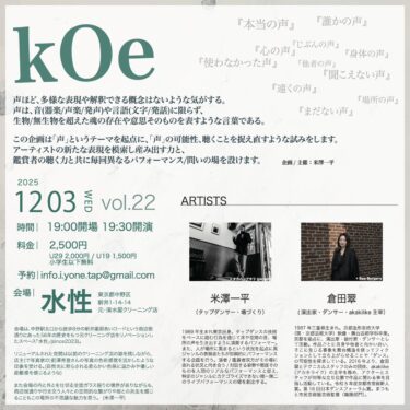 この企画は「声」というテーマを起点に、「声」の可能性/聴くことを捉え直すような試みをします。アーティストの新たな表現を模索し産み出す力と、鑑賞者の聴く力と共に毎回異なるパフォーマンス/問いの場を設けます。