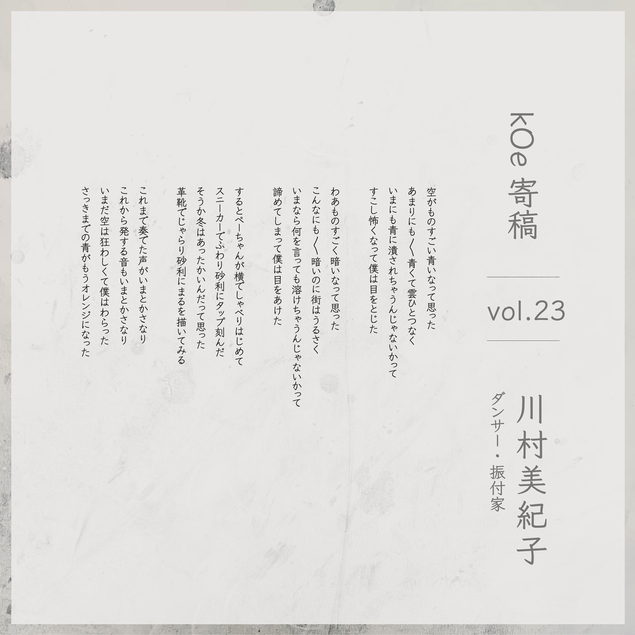 1990年、東京都生まれ。歌ったり踊ったりするのが好き。むずかしい顔をしているときは、だいたい何も考えていない。ダンスの賞をたくさんもらって16ヵ国をめぐり、作品をつくってきた。夜職をしたり田舎で暮らしたりして帰京後、現在はさまざまなアートプロジェクト等へ参加しながら、異路派 – iroha – として路上で踊り、川村産業でニットを編んでいる。https://kawamuramikiko.com
